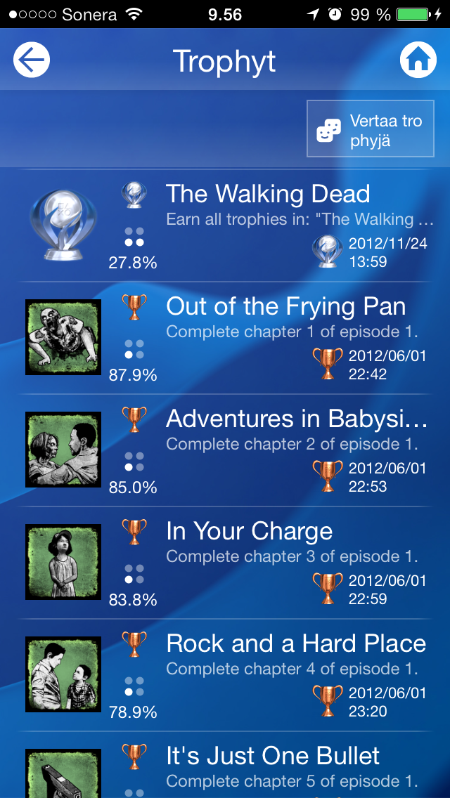 Mielenkiintoisena yksityiskohtana trophyissa näkyy ilmeisesti pelaajien trophyn saantiprosentti. Esimerkiksi The Walking Deadissa ensimmäisen episodin on aloittanut 87,9 % pelaajista, mutta läpäissyt vain 65,4 %. Koko pelin on pelannut vain 27,8 %. Ihmiset oikeasti ostavat pelejä, mutta eivät pelaa niitä muutamaa minuuttia kauempaa?