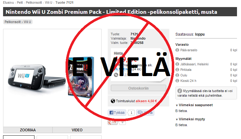 Minulla nimittäin on myös ZombiU paketti varauksessa, jossa pitäisi Premium koneen lisäksi tulla ZombiU peli ja Pro Controller. Hintaa 20 € enemmän, joten kyllähän olen sen valmis sijoittamaan peliin ja lisäohjaimeen. Ikäväkseni sain kuitenkin postia tilausta koskien ja Nintendo ei ole toimittanut Verkkokauppa.com:n – josta kone tilattuna – ainuttakaan kappaletta kyseistä pakettia. Minnehän lie Suomen erä matkannut?
