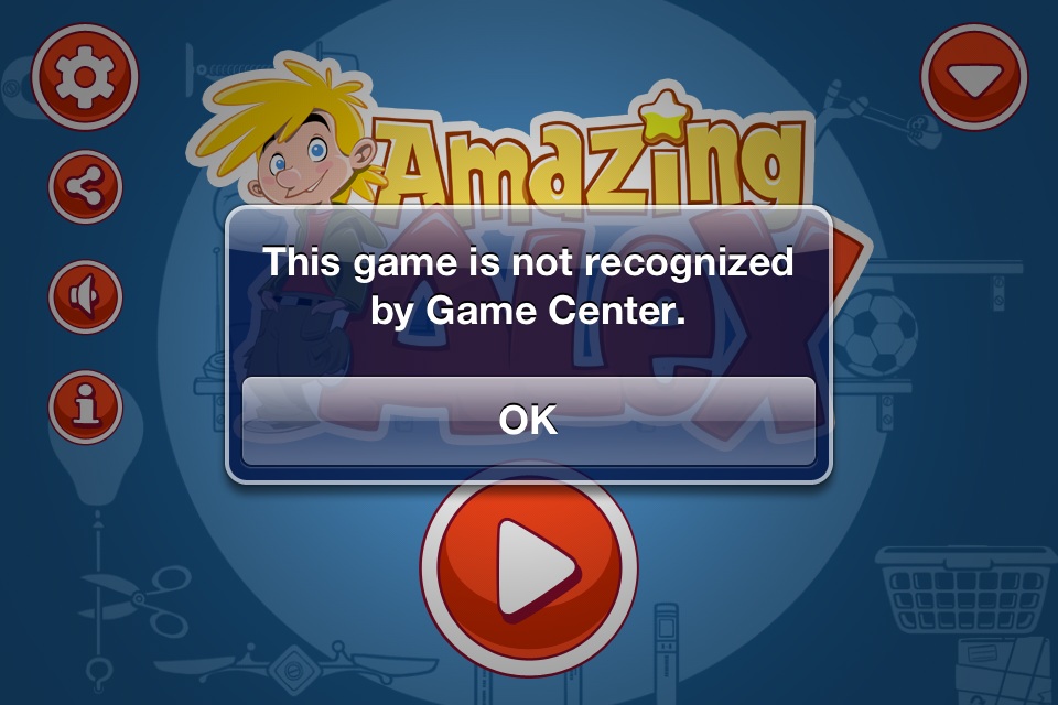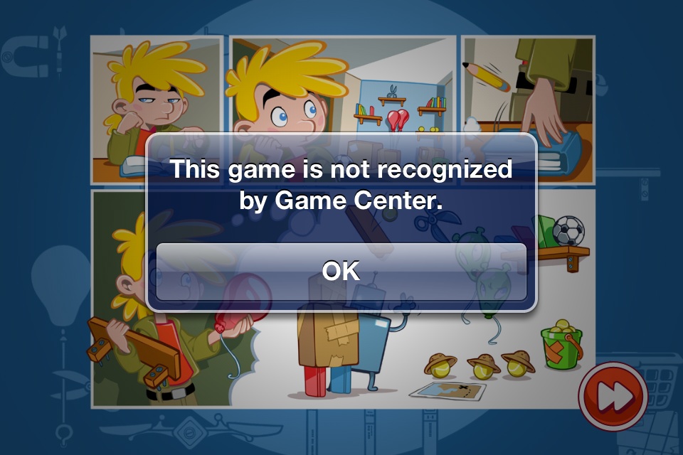 Aivan putkeen ei kuitenkaan homma mennyt. En ole päässyt vielä lainkaan pelaamaan rasittavan GameCenter ilmoitusvirheen takia. Ruudulle alkaa ilmestymään heti pelin käynnistämisen jälkeen ”This game is not recognized by Game Center” virhettä. Peli ei saa siihen yhteyttä vaan lähettelee kokoajan OK nappia. Koko päivä mennyt, enkä ole kuullut asiasta vielä muualta kuin entisen Pelaajalehden päätoimittajan Thomas Puhan Twitter viestistä. Onkohan kaikilla sitten vastaavaa ongelmaa? No odotellaan ja toivotaan, että peli korjaantuu pian.